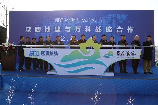 陜西省總工會主席白阿瑩,中共渭南市委書記陸治原,萬科集團(tuán)黨委書記解凍,渭南市有關(guān)領(lǐng)導(dǎo),富平縣四大班子領(lǐng)導(dǎo),萬科集團(tuán)、省地建集團(tuán)有關(guān)領(lǐng)導(dǎo)等出席儀式,富平縣有關(guān)部門負(fù)責(zé)人,省地建集團(tuán)房地產(chǎn)公司全體員工等共約600人參加簽約儀式。省地建集團(tuán)房地產(chǎn)公司副總經(jīng)理林兆豐、西安萬科企業(yè)有限公司總經(jīng)理錢嘉分別代表雙方簽署戰(zhàn)略合作協(xié)議。白阿瑩等領(lǐng)導(dǎo)共同啟動了百花溪谷商業(yè)文化街區(qū)全球招商儀式。
