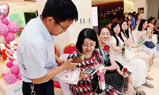 活動中,默契大考驗、心有靈犀一線牽、緣分不打折等互動游戲,拉近了青年職工之間的距離。圖為青年男女互加微信。本報記者劉強攝找“另一半”。