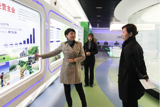 副總經(jīng)理李玲向省外國專家局局長蘭壯麗(右一)講述集團(tuán)主營業(yè)務(wù)