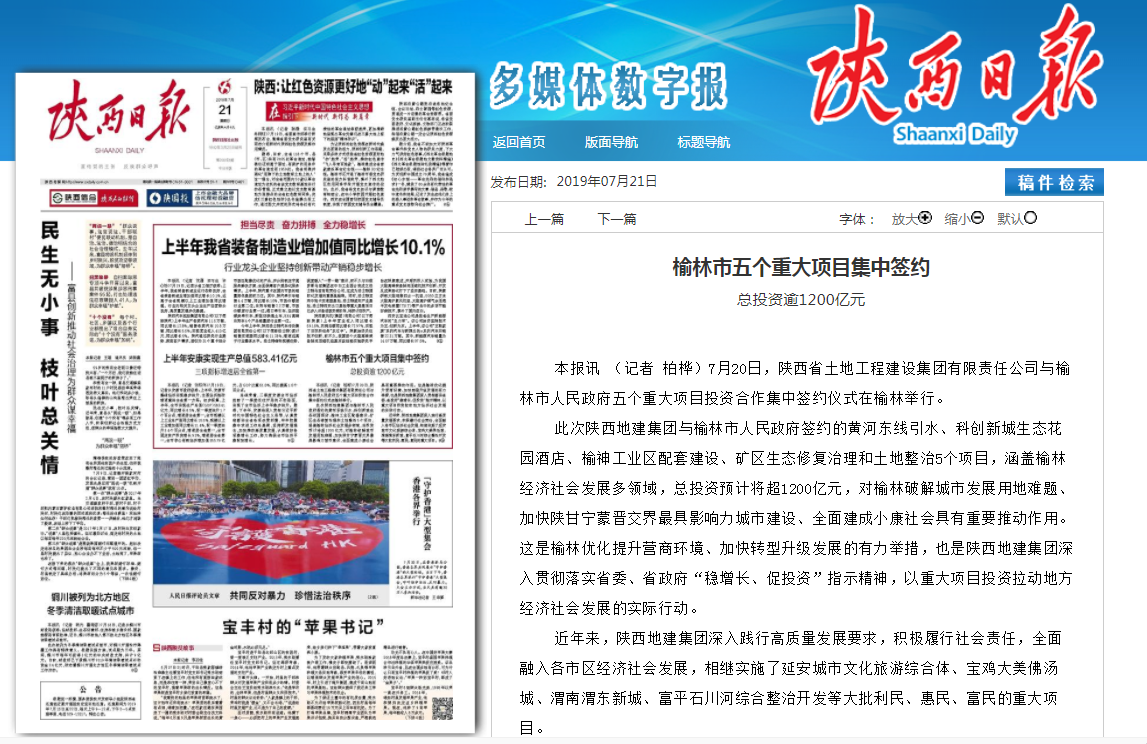 本報訊(記者柏樺)7月20日,陜西省土地工程建設(shè)集團有限責(zé)任公司與榆林市人民政府五個重大項目投資合作集中簽約儀式在榆林舉行。
