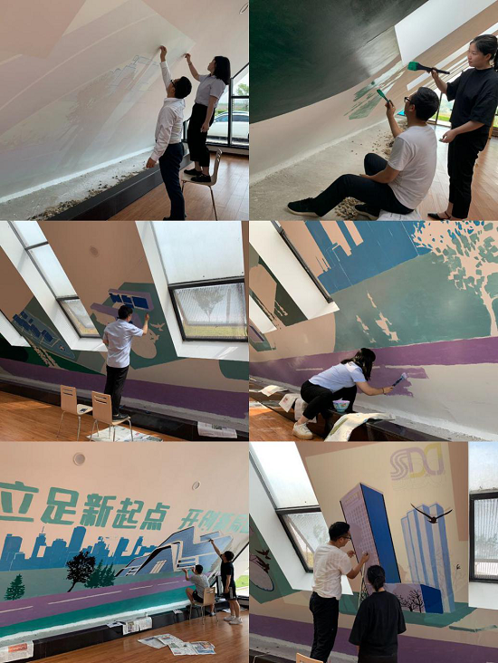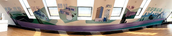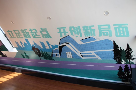 企業(yè)文化墻充分利用綜合服務(wù)中心閱覽室空白墻壁,全長(zhǎng)約25米,內(nèi)容包括了渭東新城建設(shè)項(xiàng)目、榆林110萬(wàn)畝噸糧田土地整治重大工程大紀(jì)汗示范區(qū)項(xiàng)目、延安新區(qū)城市文化旅游綜合體項(xiàng)目、新建商洛中學(xué)項(xiàng)目、自然資源部退化及未利用土地整治工程重點(diǎn)實(shí)驗(yàn)室等一批集團(tuán)重點(diǎn)項(xiàng)目。企業(yè)文化墻充分融合集團(tuán)“三特”精神,藍(lán)、綠色的主色調(diào)與集團(tuán)公司以凈土工程為核心的新型城鎮(zhèn)化建設(shè)發(fā)展戰(zhàn)略相呼應(yīng),并突出“求實(shí)、進(jìn)取、創(chuàng)新、團(tuán)結(jié)、認(rèn)真”和“立足新起點(diǎn)、開創(chuàng)新局面”的企業(yè)精神,色彩明亮,簡(jiǎn)潔大方,宣傳了集團(tuán)精品工程,美化了駐地環(huán)境。在手繪過(guò)程中,增強(qiáng)了青年員工的企業(yè)歸屬感、認(rèn)同感,提升了團(tuán)隊(duì)凝聚力,傳播了企業(yè)文化建設(shè)的正能量。