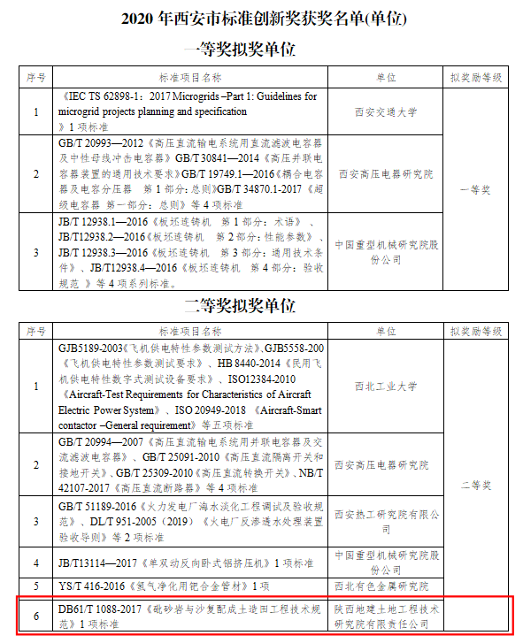 近日,西安市市場監(jiān)督管理局公布了2020年度西安市標(biāo)準(zhǔn)創(chuàng)新獎(jiǎng)獲獎(jiǎng)項(xiàng)目,由地建研究院負(fù)責(zé)申報(bào)的《砒砂巖與沙復(fù)配成土造田工程技術(shù)規(guī)范》榮獲二等獎(jiǎng),獎(jiǎng)金十萬元。