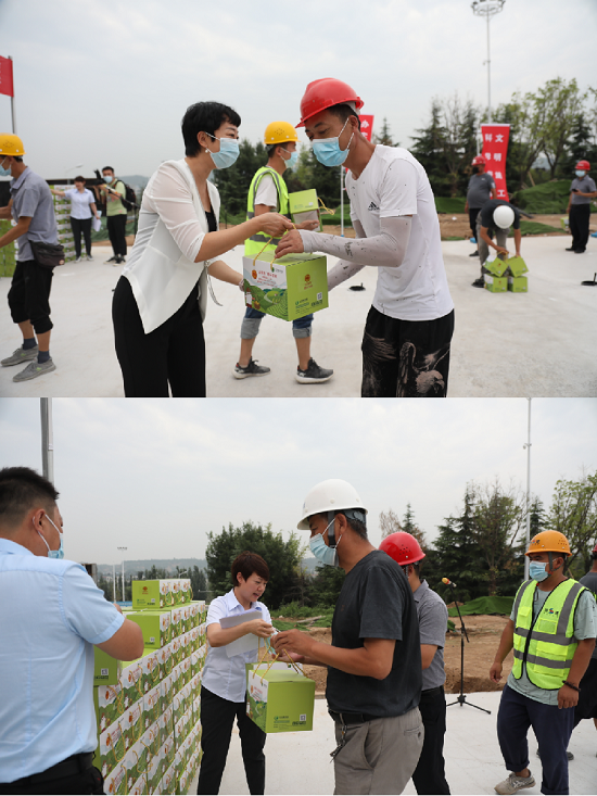 活動(dòng)現(xiàn)場,周曉芳一行為項(xiàng)目一線施工人員送上了400余份清涼禮包,仔細(xì)詢問了職工的工作和生活情況,并對大家不畏酷暑堅(jiān)守生產(chǎn)一線的精神表示衷心的感謝,叮囑他們在高溫天氣作業(yè),要注意防暑降溫,做好勞動(dòng)保護(hù)。在場職工紛紛表示,一定會(huì)堅(jiān)持發(fā)揚(yáng)不怕苦、不怕累、攻艱克難、勇于創(chuàng)新的精神,提高安全生產(chǎn)意識(shí),調(diào)動(dòng)勞動(dòng)積極性,為項(xiàng)目建設(shè)貢獻(xiàn)力量。